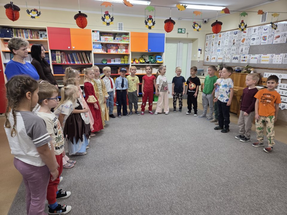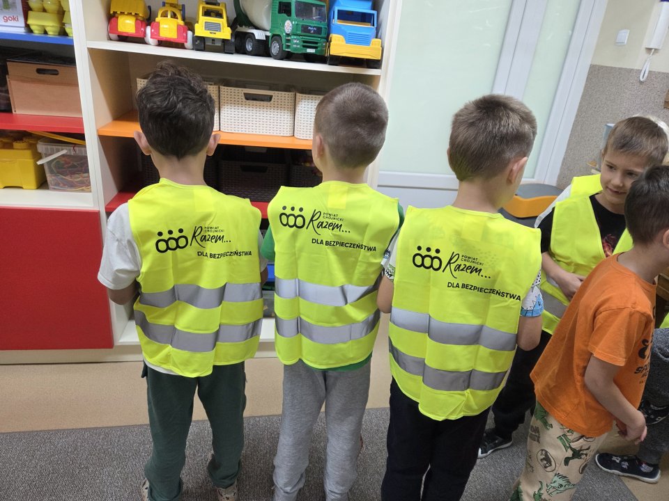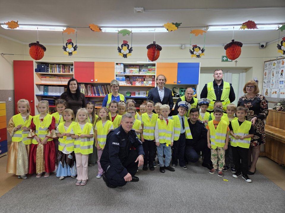 W ramach wizyty dzieci otrzymały odblaski i kamizelki odblaskowe, które pomogą im być widocznymi i bezpiecznymi, zwłaszcza podczas jesiennych spacerów.