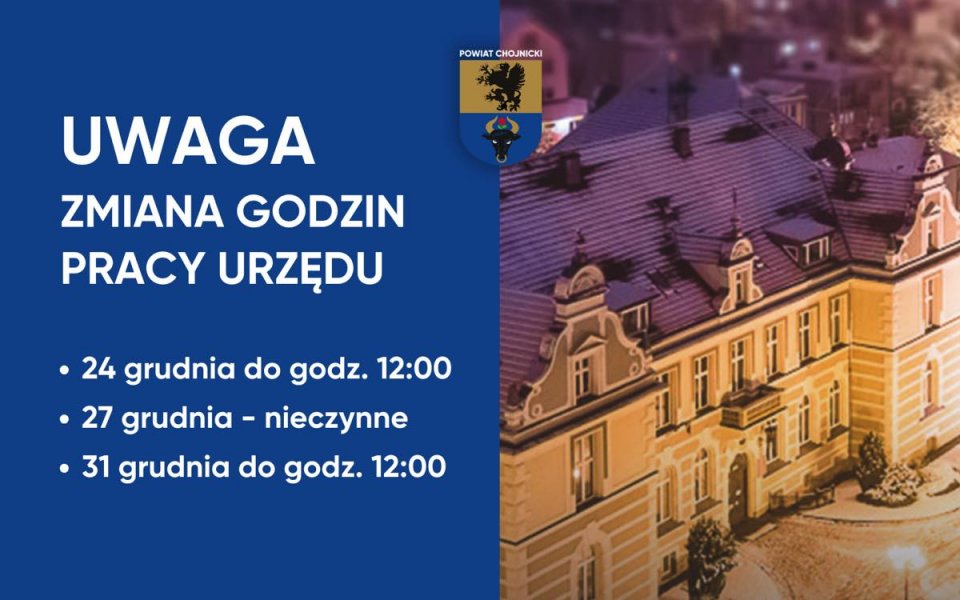 Informujemy o zmianie godzin pracy Starostwa Powiatowego w Chojnicach w okresie świątecznym.