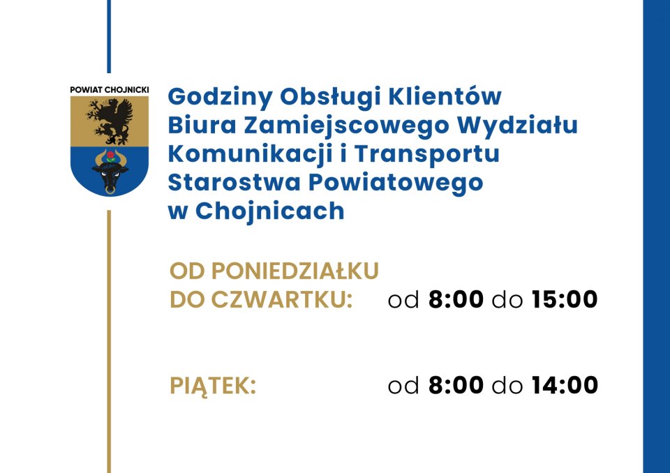 Od poniedziałku 1 września zmienią się godziny obsługi interesantów w Biurze Zamiejscowym Wydziału Komunikacji i Transportu w Czersku.